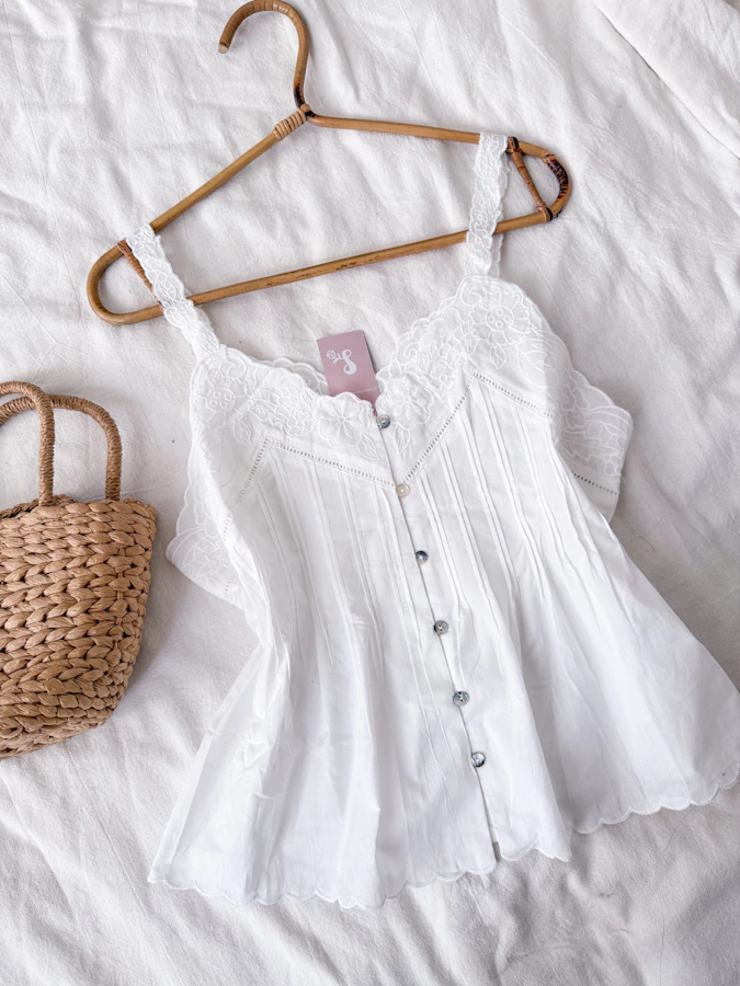 Blusa blanca con botones delanteros y broderie en escote y breteles.